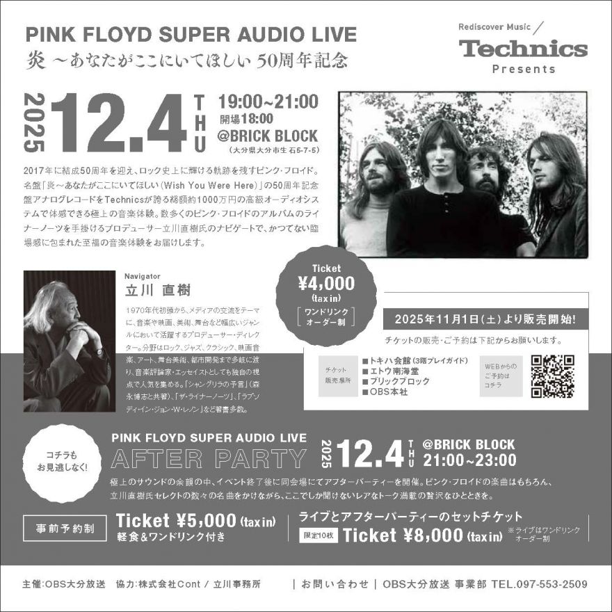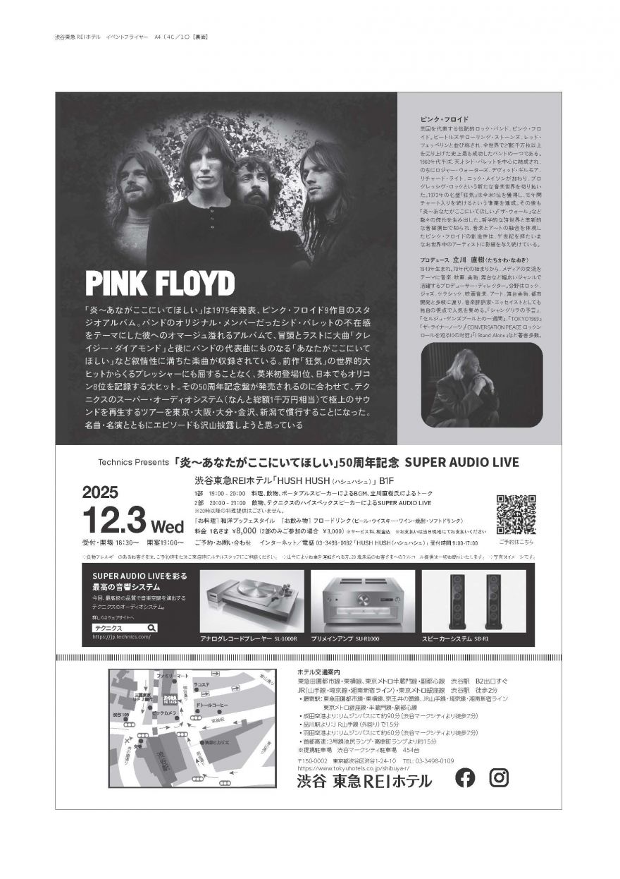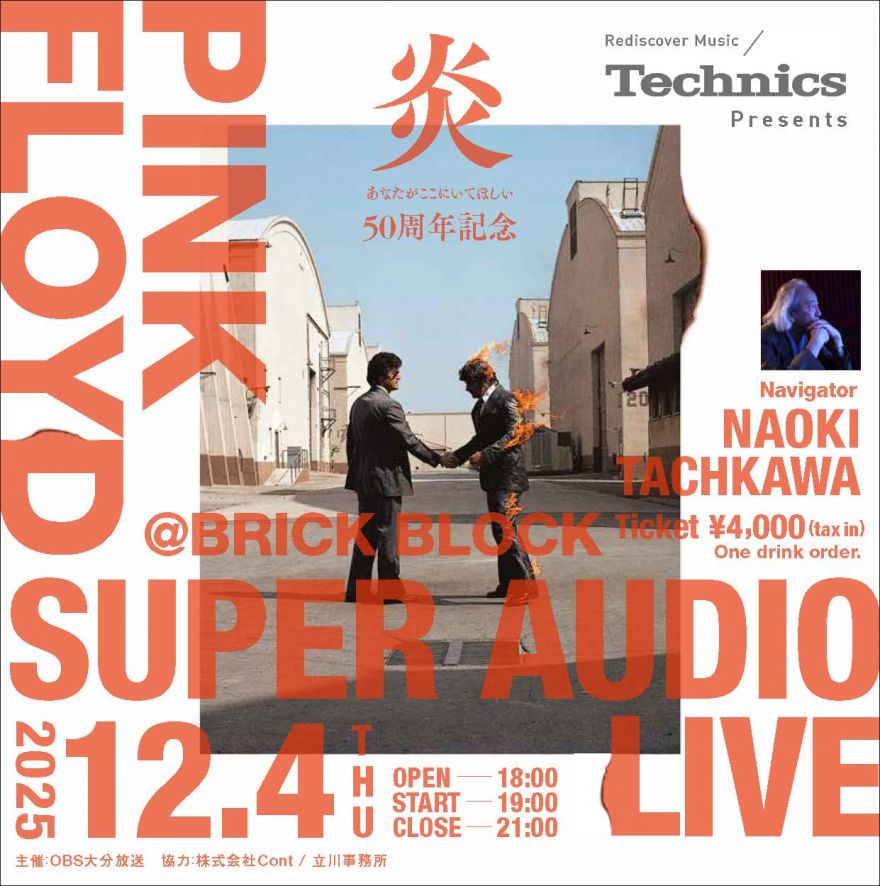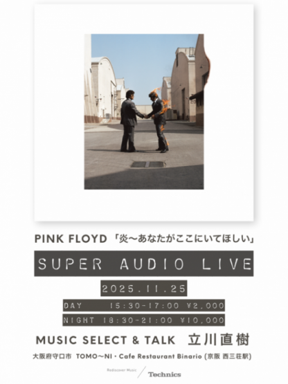 ピンク・フロイドの歴史的名盤『炎~あなたがここにいてほしい(Wish You Were Here)』の50周年を記念して、2025年12月12日に豪華デラックス・ボックス・セット、日本独自企画2CD+BD(7インチ紙ジャケット仕様)、LPなどが発売。この記念すべきリリースに合わせ、東京・大阪・大分・金沢、新潟、全国5か所でテクニクスが誇る最高級スーパー・オーディオシステムで極上のサウンドを再生するイベント「ピンク・フロイド『炎~あなたがここにいてほしい』SUPER AUDIO LIVE TOUR」が開催されることが決定した。オリジナル・アナログ盤を中心に数多くのピンク・フロイドのアルバムのライナーノーツを手掛けるプロデューサー立川直樹氏選曲の楽曲を、トークとともに総額1000万円を超えるテクニクス最高級オーディオで体験できる贅沢で特別な空間で『炎~あなたがここにいてほしい』の魅力に迫る。